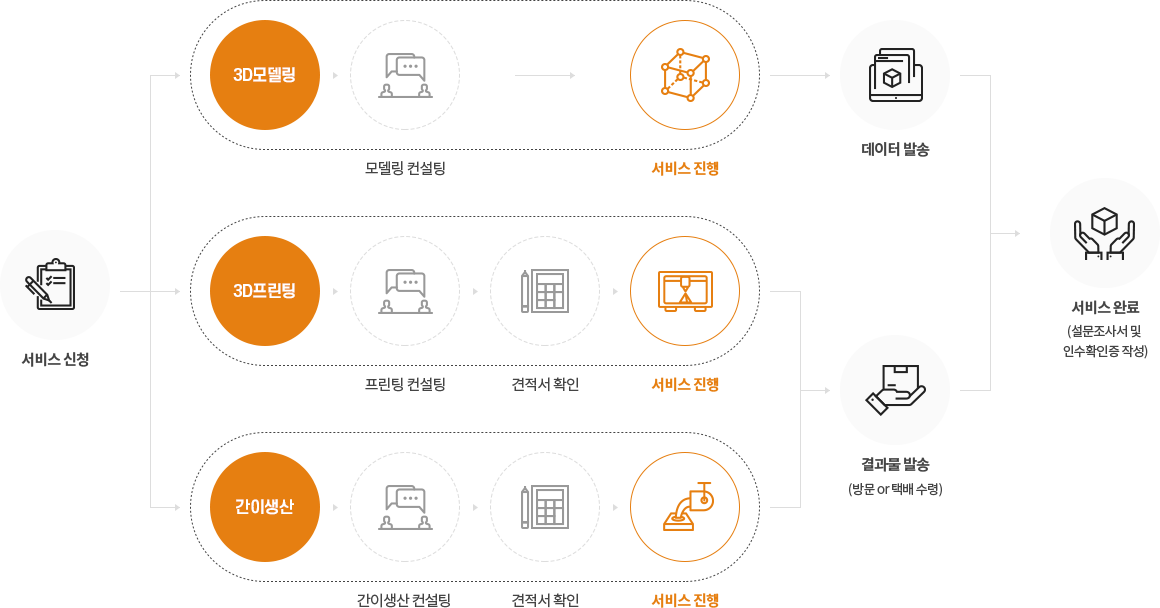 용도에 따른 장비 매칭 서비스 지원 및 산업용 3D프린터를 이용한 고품질 출력물 제공